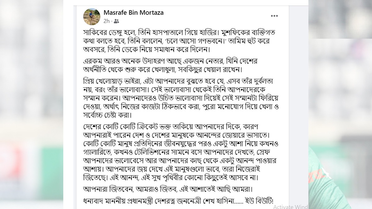 নিজের ব্যক্তিগত ফেসবুক অ্যাকাউন্টে মাশরাফি লিখেছেন, ‘সাকিবের ডেঙ্গু হলে, তিনি হাসপাতালে গিয়ে হাজির। মুশফিকের ব্যক্তিগত কথা বলতে হবে, তিনি বললেন, ‘‘চলে আসো গণভবনে।’’ তামিম হুট করে অবসরে, তিনি ডেকে নিয়ে সমাধান করে দিলেন। এরকম আরও অনেক উদাহরণ আছে একজন নেতার, যিনি দেশের অর্থনীতি থেকে শুরু করে খেলাধুলা, সবকিছুর খেয়াল রাখেন।’