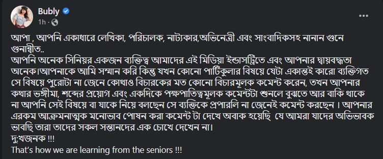 বুবলী তার দেওয়া পোস্টে লেখেন, “আপা, আপনি একাধারে লেখিকা, পরিচালক, নাট্যকার, অভিনেত্রী এবং সাংবাদিকসহ নানান গুনে গুনান্বীত। আপনি অনেক সিনিয়র একজন ব্যক্তিত্ব আমাদের এই মিডিয়া ইন্ডাস্ট্রিতে এবং আপনার দ্বায়বদ্ধতা অনেক। আপনাকে আমি সম্মান করি কিন্তু যখন কোনো পার্টিকুলার বিষয়ে যেটা একান্তই কারো ব্যক্তিগত।”